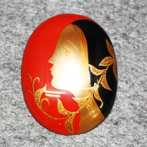 ・小判型、朱色、梨地、横顔の蒔絵仕上げ、輪島塗ブローチの全景