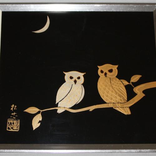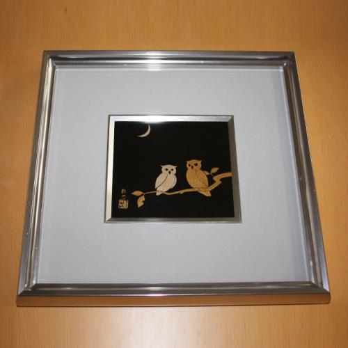 黒色、アルミ枠、ふくろうの蒔絵仕上げの輪島塗 漆額 (パネル) です。